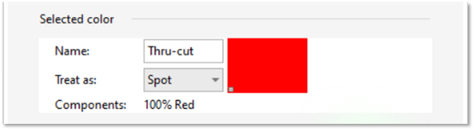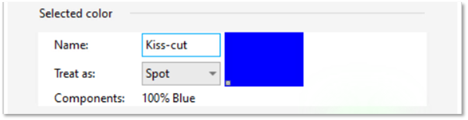 Swap the names of the “Thru-cut” (100% Blue) and “Kiss-cut” (100% Red) spot color swatches in the palette so that 100% Red is used for “Thru-cut”. This step is necessary to enable use of the FlexCut function in Summa WinPlot.