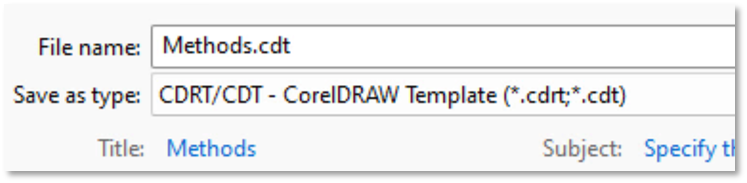 Save the resulting file in an easily accessible place as file type CDRT/CDT – CorelDraw Template (*.cdrt, *.cdt). Edit the default file extension if necessary to name the file exactly “Methods.cdt”