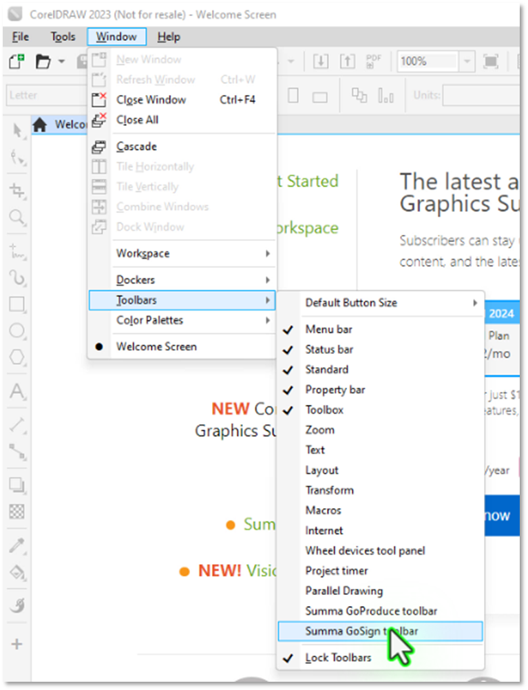Launch CorelDraw, then select Window: Toolbars/Summa GoSign Toolbar to show the plugin controls.